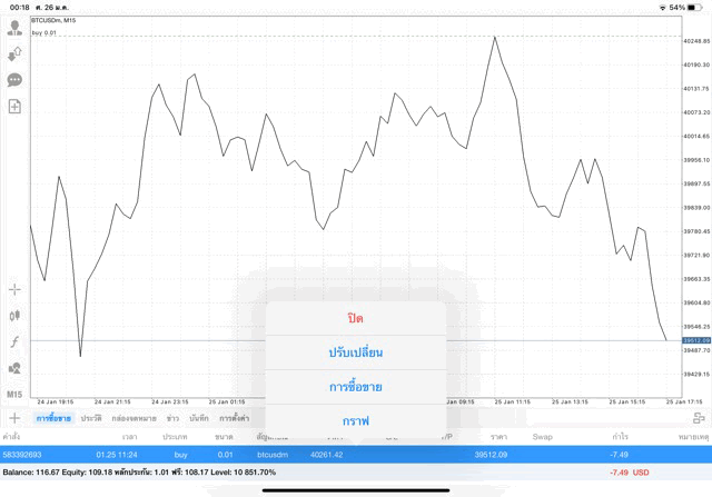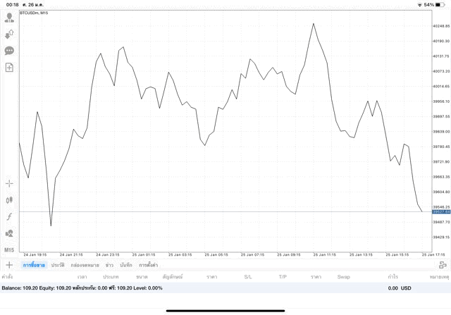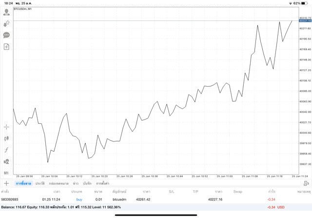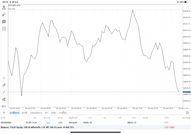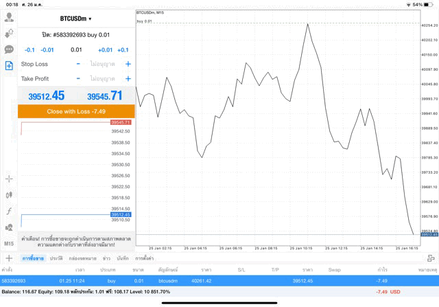 เริ่มแล้ว การเทรด Crypto BTCUSD 0.01 lot บนแอพเล่นหุ้น mt4 เมื่อราคามีการเปลี่ยนแปลงจะส่งผลต่อกำไรหรือขาดทุนขึ้นกับการเทรดครั้งนี้ เริ่มต้น ติดลบก่อนนะ