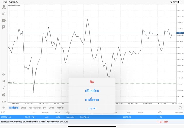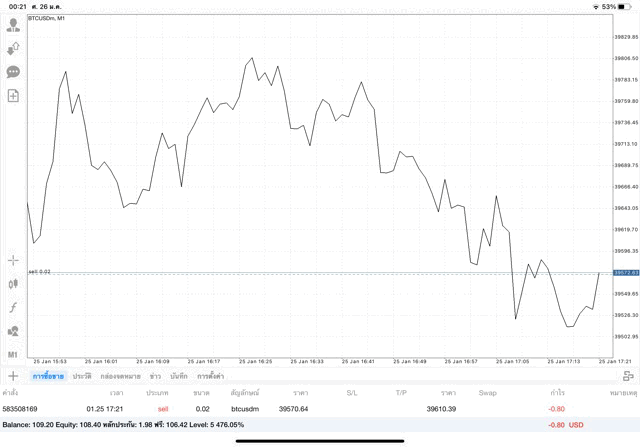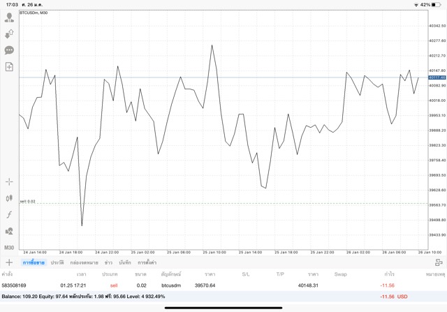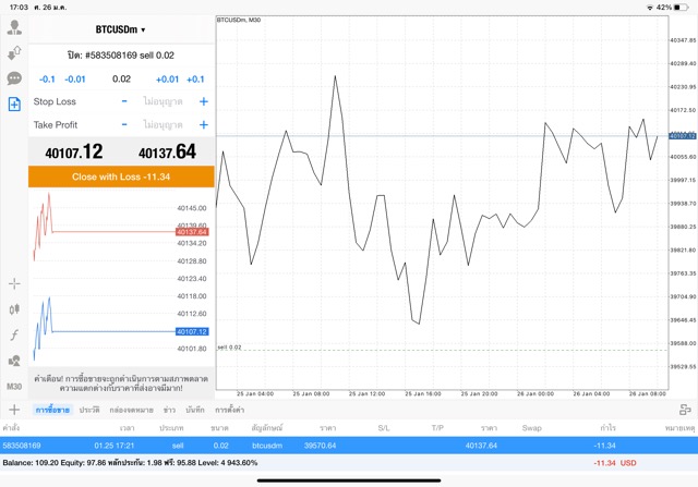 เริ่มแล้ว การเทรด Crypto BTCUSD 0.02 lot บนแอพเล่นหุ้น mt4 เมื่อราคามีการเปลี่ยนแปลงจะส่งผลต่อกำไรหรือขาดทุนขึ้นกับการเทรดครั้งนี้ เริ่มต้น ติดลบก่อนนะ