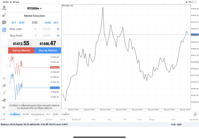ปุ่ม Buy by market ได้กำไรเมื่อราคา BTCUSD ขึ้น แต่จะขาดทุนเมื่อราคา BTCUSD ลง