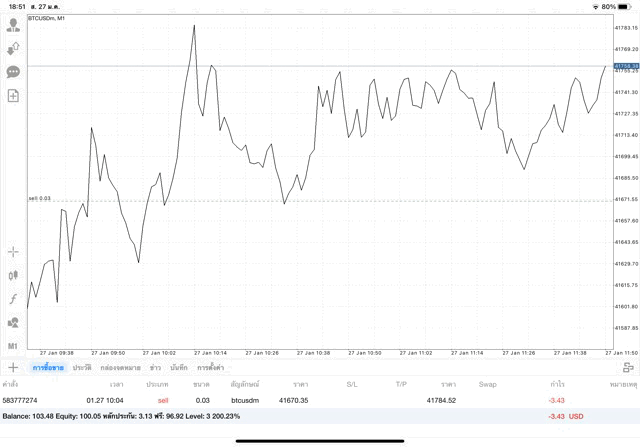 เริ่มแล้ว การเทรด Crypto BTCUSD 0.03 lot บนแอพเล่นหุ้น mt4 เมื่อราคามีการเปลี่ยนแปลงจะส่งผลต่อกำไรหรือขาดทุนขึ้นกับการเทรดครั้งนี้ เริ่มต้น ติดลบก่อนนะ