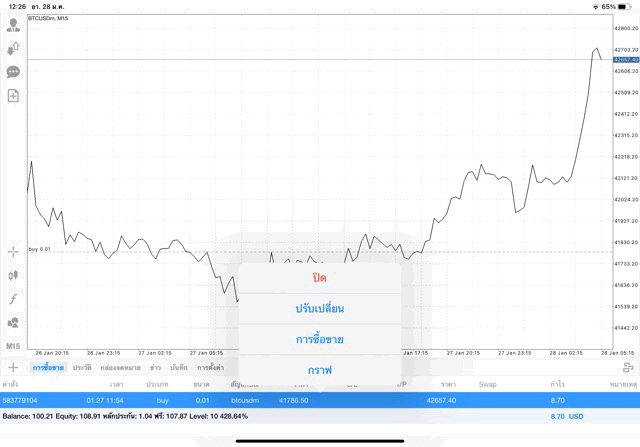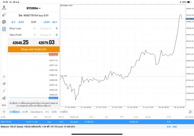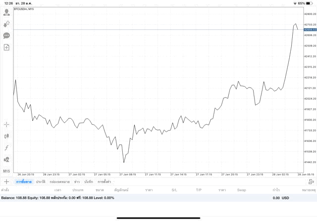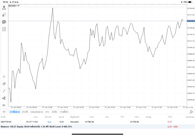 เริ่มแล้ว การเทรด Crypto BTCUSD 0.01 lot บนแอพเล่นหุ้น mt4 เมื่อราคามีการเปลี่ยนแปลงจะส่งผลต่อกำไรหรือขาดทุนขึ้นกับการเทรดครั้งนี้ เริ่มต้น ติดลบก่อนนะ