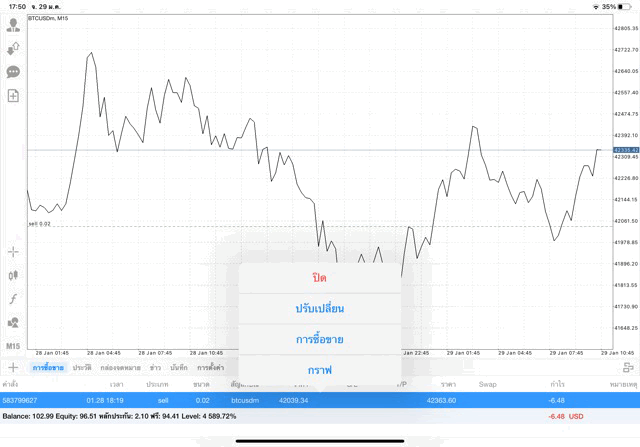 เริ่มแล้ว การเทรด Crypto BTCUSD 0.02 lot บนแอพเล่นหุ้น mt4 เมื่อราคามีการเปลี่ยนแปลงจะส่งผลต่อกำไรหรือขาดทุนขึ้นกับการเทรดครั้งนี้ เริ่มต้น ติดลบก่อนนะ
