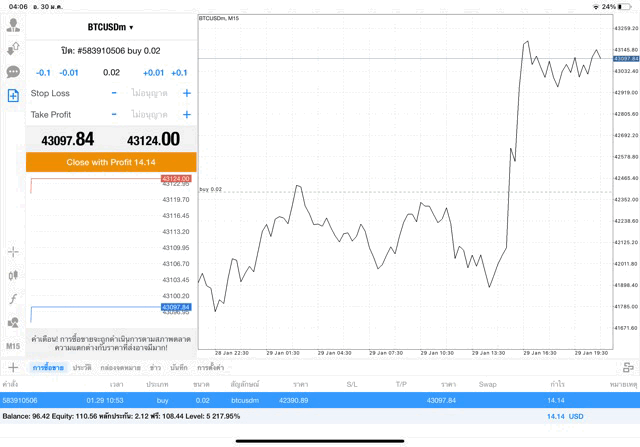 การเทรด Crypto BTCUSD 0.02 lot บนแอพเล่นหุ้น mt4 โบรกเกอร์ forex exness