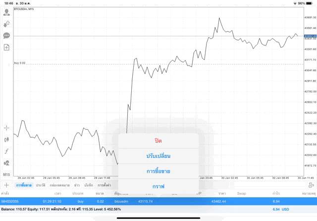 การเทรด Crypto BTCUSD 0.02 lot บนแอพเล่นหุ้น mt4 โบรกเกอร์ forex exness