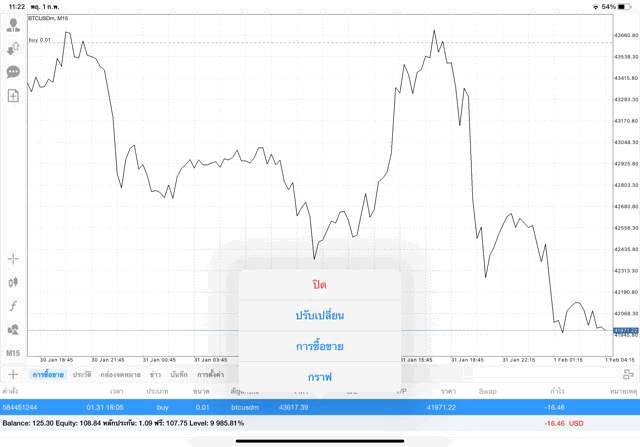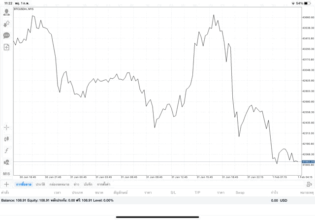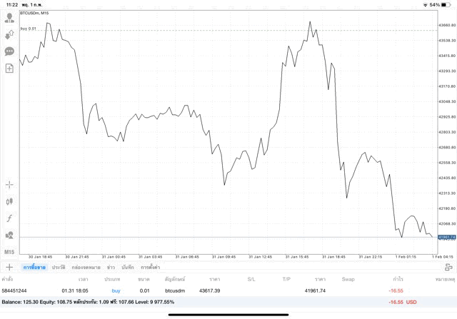 เริ่มแล้ว การเทรด Crypto BTCUSD 0.01 lot บนแอพเล่นหุ้น mt4 เมื่อราคามีการเปลี่ยนแปลงจะส่งผลต่อกำไรหรือขาดทุนขึ้นกับการเทรดครั้งนี้ เริ่มต้น ติดลบก่อนนะ