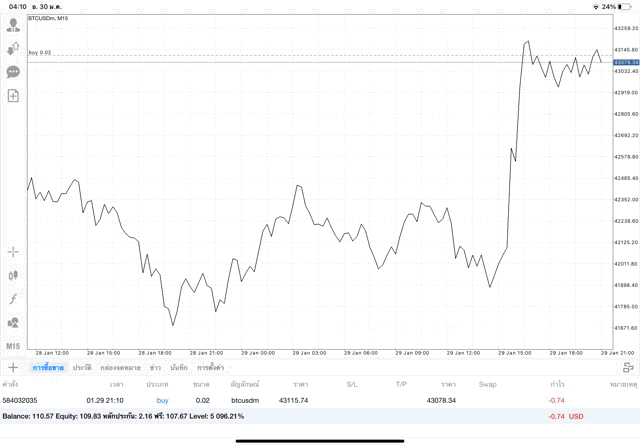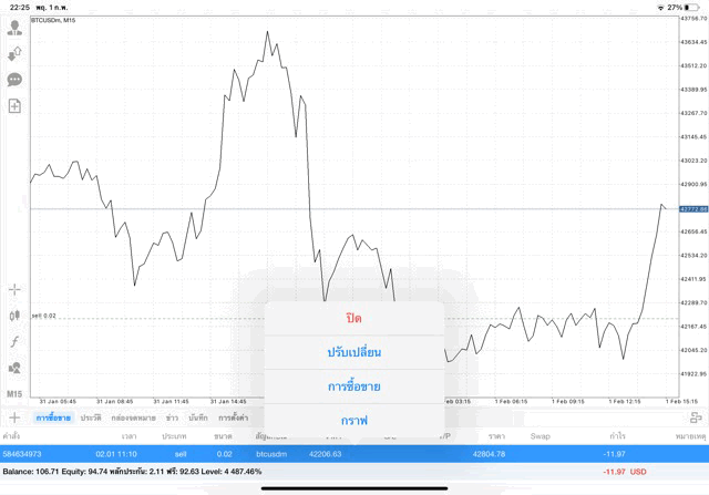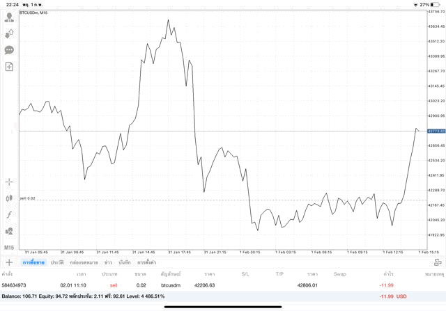 เริ่มแล้ว การเทรด Crypto BTCUSD 0.02 lot บนแอพเล่นหุ้น mt4 เมื่อราคามีการเปลี่ยนแปลงจะส่งผลต่อกำไรหรือขาดทุนขึ้นกับการเทรดครั้งนี้ เริ่มต้น ติดลบก่อนนะ