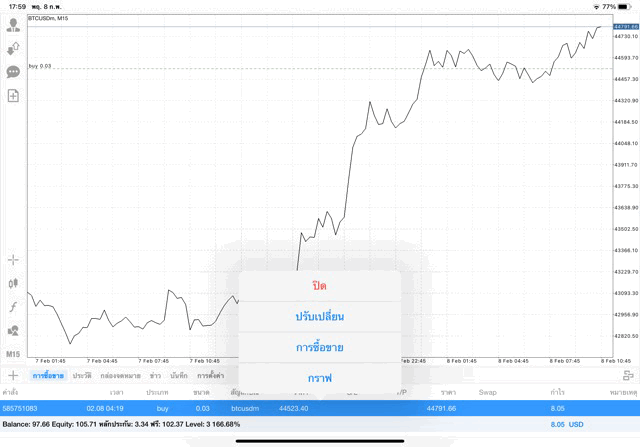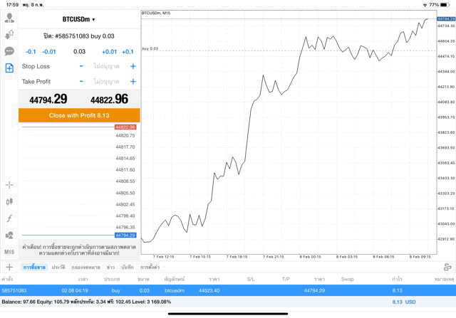 การเทรด Crypto BTCUSD 0.03 lot บนแอพเล่นหุ้น mt4 โบรกเกอร์ forex exness
