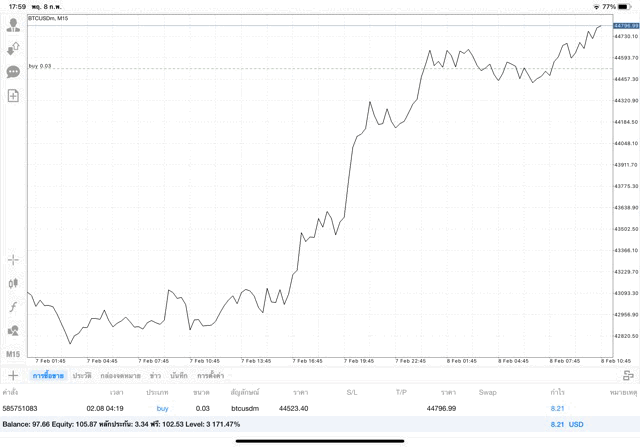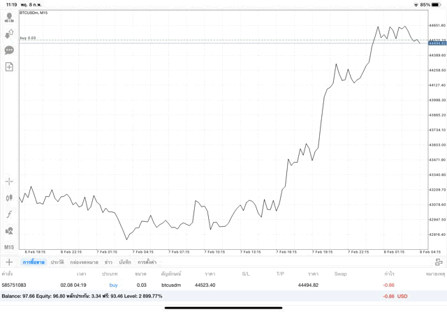 เริ่มแล้ว การเทรด Crypto BTCUSD 0.03 lot บนแอพเล่นหุ้น mt4 เมื่อราคามีการเปลี่ยนแปลงจะส่งผลต่อกำไรหรือขาดทุนขึ้นกับการเทรดครั้งนี้ เริ่มต้น ติดลบก่อนนะ