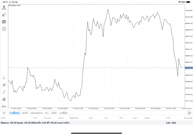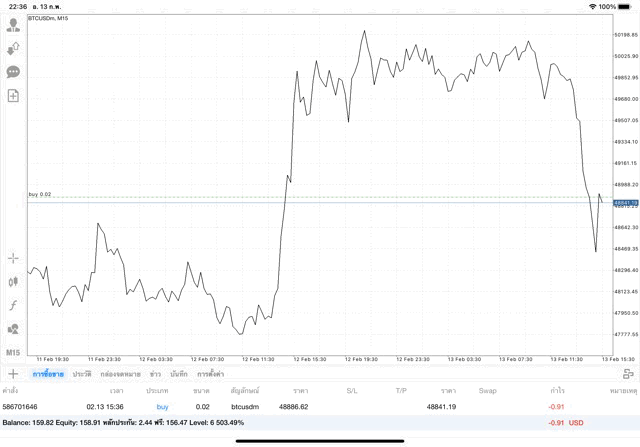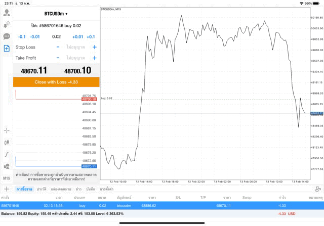 การเทรด Crypto BTCUSD 0.02 lot บนแอพเล่นหุ้น mt4 โบรกเกอร์ forex exness