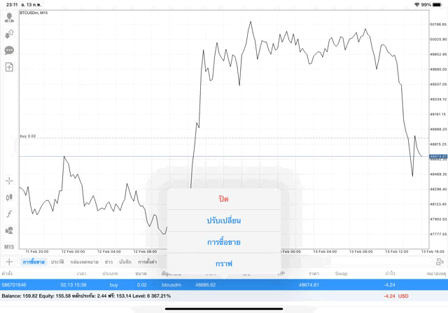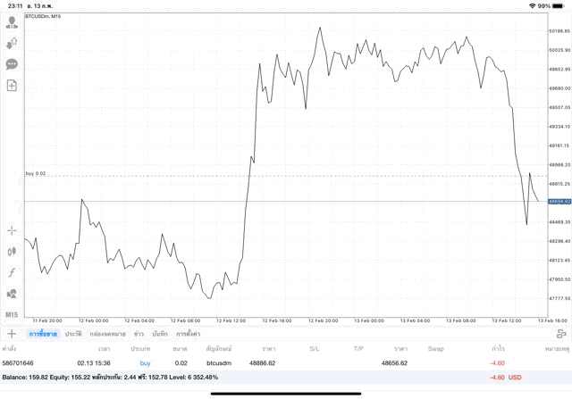 เริ่มแล้ว การเทรด Crypto BTCUSD 0.02 lot บนแอพเล่นหุ้น mt4 เมื่อราคามีการเปลี่ยนแปลงจะส่งผลต่อกำไรหรือขาดทุนขึ้นกับการเทรดครั้งนี้ เริ่มต้น ติดลบก่อนนะ