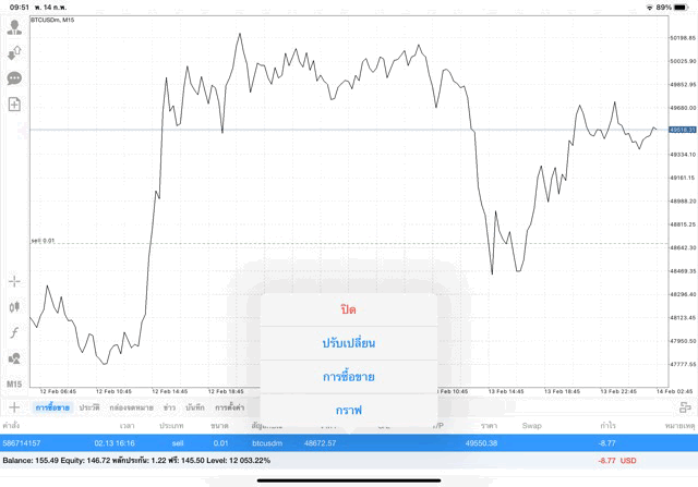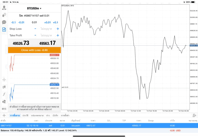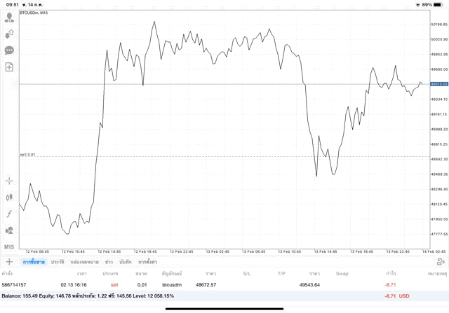 การเทรด Crypto BTCUSD 0.01 lot บนแอพเล่นหุ้น mt4 โบรกเกอร์ forex exness