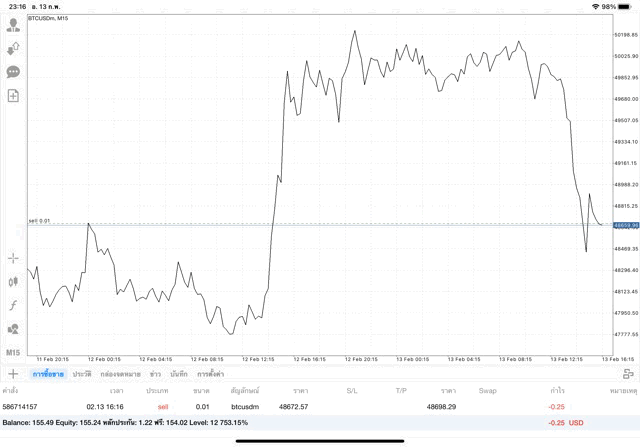เริ่มแล้ว การเทรด Crypto BTCUSD 0.01 lot บนแอพเล่นหุ้น mt4 เมื่อราคามีการเปลี่ยนแปลงจะส่งผลต่อกำไรหรือขาดทุนขึ้นกับการเทรดครั้งนี้ เริ่มต้น ติดลบก่อนนะ