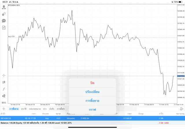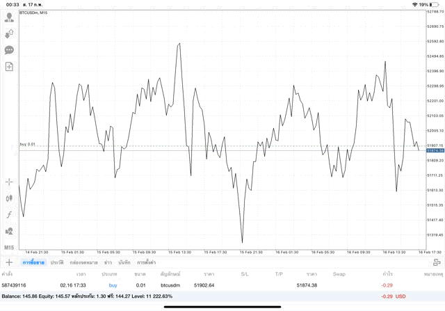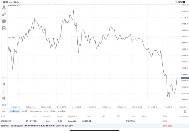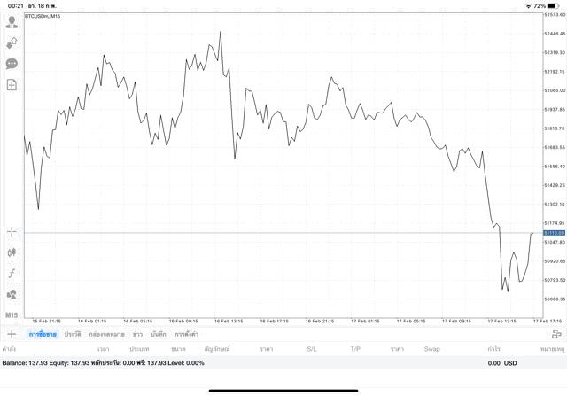 เริ่มแล้ว การเทรด Crypto BTCUSD 0.01 lot บนแอพเล่นหุ้น mt4 เมื่อราคามีการเปลี่ยนแปลงจะส่งผลต่อกำไรหรือขาดทุนขึ้นกับการเทรดครั้งนี้ เริ่มต้น ติดลบก่อนนะ