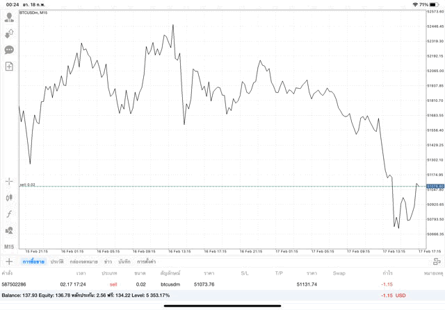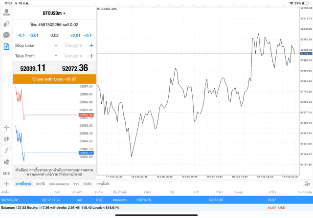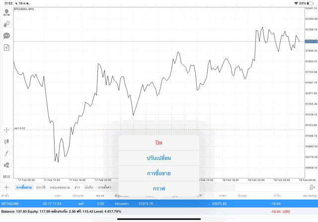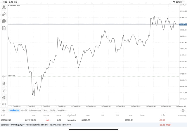 เริ่มแล้ว การเทรด Crypto BTCUSD 0.02 lot บนแอพเล่นหุ้น mt4 เมื่อราคามีการเปลี่ยนแปลงจะส่งผลต่อกำไรหรือขาดทุนขึ้นกับการเทรดครั้งนี้ เริ่มต้น ติดลบก่อนนะ