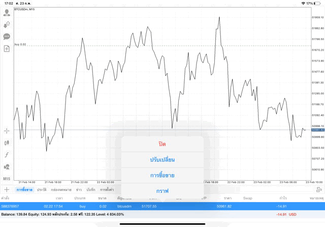 การเทรด Crypto BTCUSD 0.02 lot บนแอพเล่นหุ้น mt4 โบรกเกอร์ forex exness