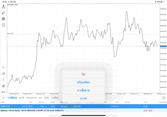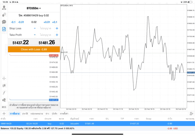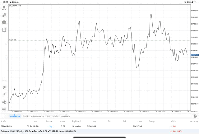 เริ่มแล้ว การเทรด Crypto BTCUSD 0.02 lot บนแอพเล่นหุ้น mt4 เมื่อราคามีการเปลี่ยนแปลงจะส่งผลต่อกำไรหรือขาดทุนขึ้นกับการเทรดครั้งนี้ เริ่มต้น ติดลบก่อนนะ