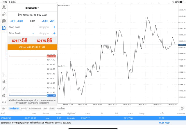การเทรด Crypto BTCUSD 0.02 lot บนแอพเล่นหุ้น mt4 โบรกเกอร์ forex exness