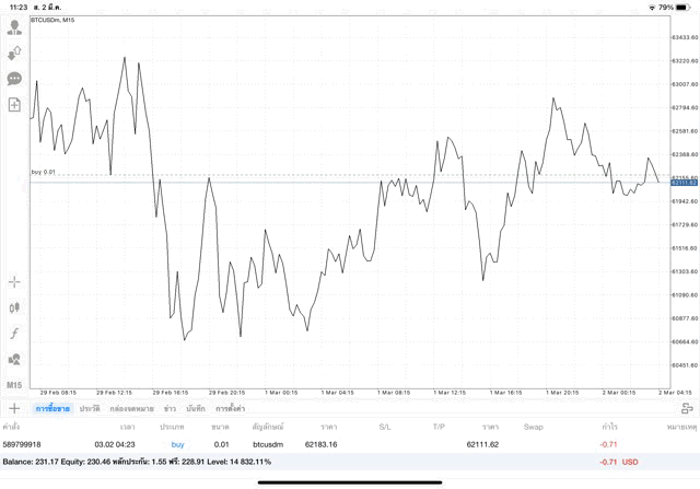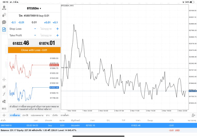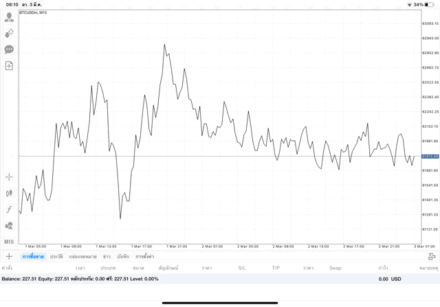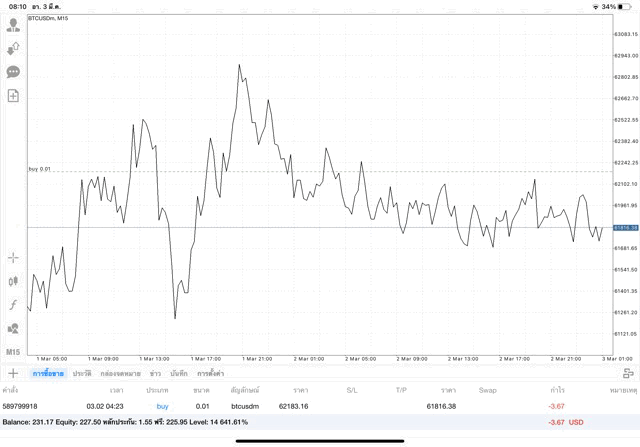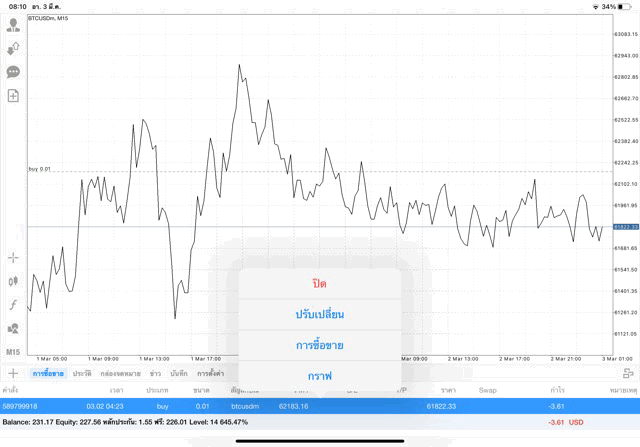เริ่มแล้ว การเทรด Crypto BTCUSD 0.01 lot บนแอพเล่นหุ้น mt4 เมื่อราคามีการเปลี่ยนแปลงจะส่งผลต่อกำไรหรือขาดทุนขึ้นกับการเทรดครั้งนี้ เริ่มต้น ติดลบก่อนนะ