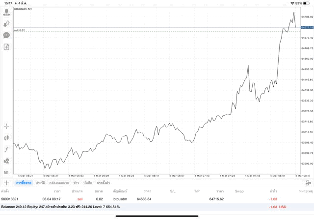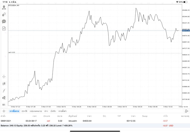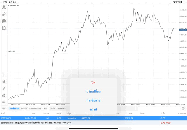 การเทรด Crypto BTCUSD 0.02 lot บนแอพเล่นหุ้น mt4 โบรกเกอร์ forex exness