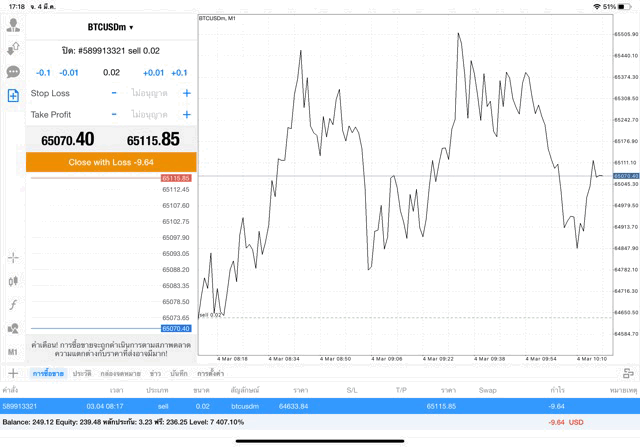 เริ่มแล้ว การเทรด Crypto BTCUSD 0.02 lot บนแอพเล่นหุ้น mt4 เมื่อราคามีการเปลี่ยนแปลงจะส่งผลต่อกำไรหรือขาดทุนขึ้นกับการเทรดครั้งนี้ เริ่มต้น ติดลบก่อนนะ