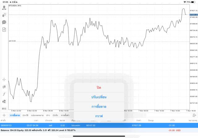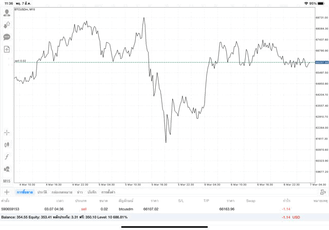 เริ่มแล้ว การเทรด Crypto BTCUSD 0.02 lot บนแอพเล่นหุ้น mt4 เมื่อราคามีการเปลี่ยนแปลงจะส่งผลต่อกำไรหรือขาดทุนขึ้นกับการเทรดครั้งนี้ เริ่มต้น ติดลบก่อนนะ