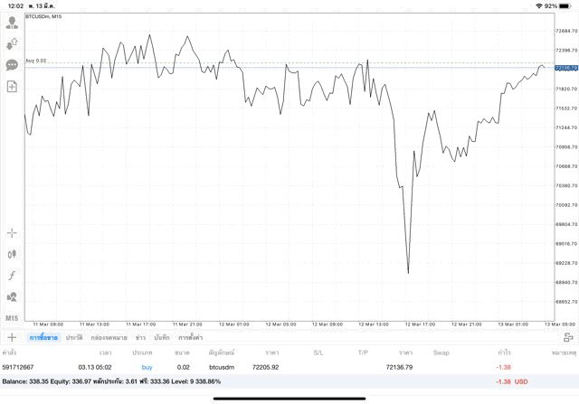 เริ่มแล้ว การเทรด Crypto BTCUSD 0.02 lot บนแอพเล่นหุ้น mt4 เมื่อราคามีการเปลี่ยนแปลงจะส่งผลต่อกำไรหรือขาดทุนขึ้นกับการเทรดครั้งนี้ เริ่มต้น ติดลบก่อนนะ