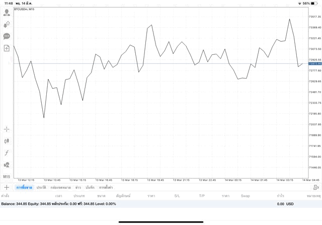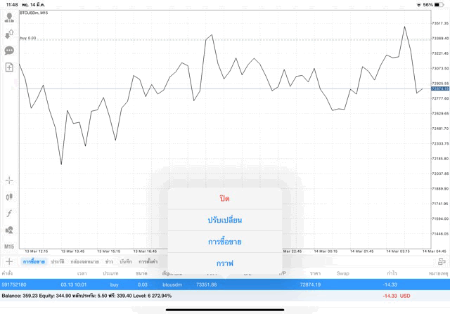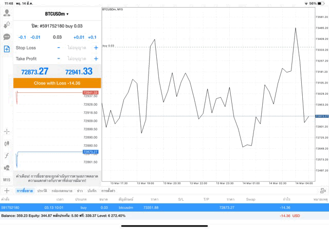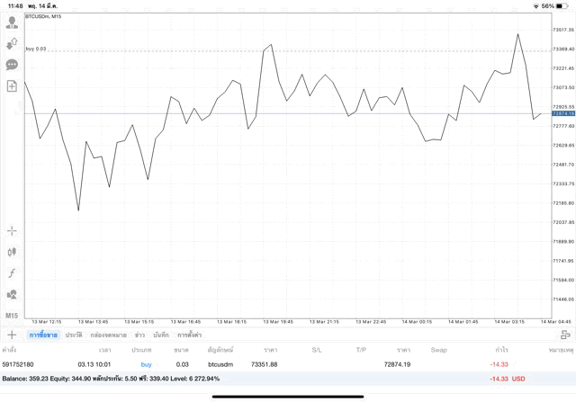 การเทรด Crypto BTCUSD 0.03 lot บนแอพเล่นหุ้น mt4 โบรกเกอร์ forex exness