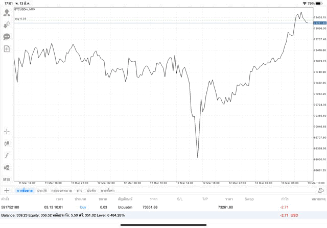 เริ่มแล้ว การเทรด Crypto BTCUSD 0.03 lot บนแอพเล่นหุ้น mt4 เมื่อราคามีการเปลี่ยนแปลงจะส่งผลต่อกำไรหรือขาดทุนขึ้นกับการเทรดครั้งนี้ เริ่มต้น ติดลบก่อนนะ