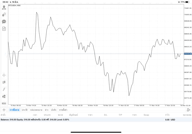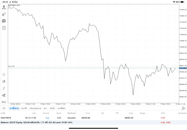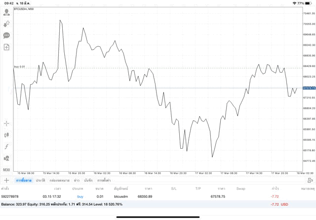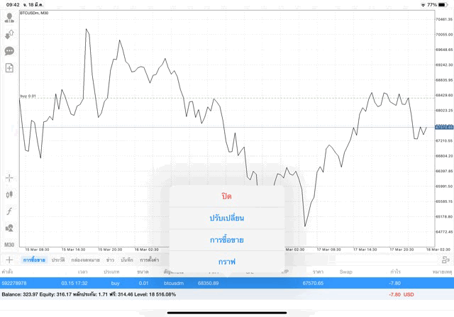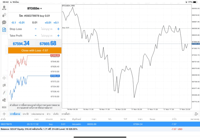 เริ่มแล้ว การเทรด Crypto BTCUSD 0.01 lot บนแอพเล่นหุ้น mt4 เมื่อราคามีการเปลี่ยนแปลงจะส่งผลต่อกำไรหรือขาดทุนขึ้นกับการเทรดครั้งนี้ เริ่มต้น ติดลบก่อนนะ