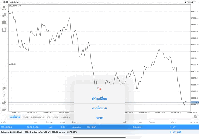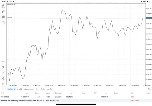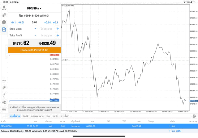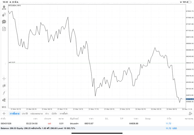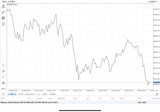 เริ่มแล้ว การเทรด Crypto BTCUSD 0.01 lot บนแอพเล่นหุ้น mt4 เมื่อราคามีการเปลี่ยนแปลงจะส่งผลต่อกำไรหรือขาดทุนขึ้นกับการเทรดครั้งนี้ เริ่มต้น ติดลบก่อนนะ