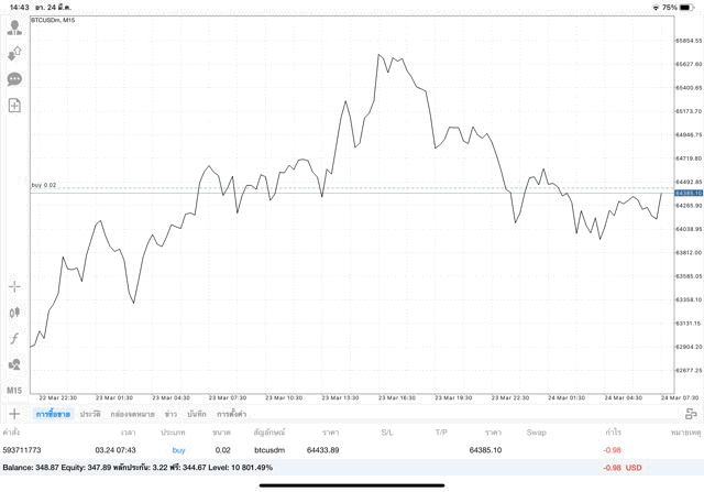 เริ่มแล้ว การเทรด Crypto BTCUSD 0.02 lot บนแอพเล่นหุ้น mt4 เมื่อราคามีการเปลี่ยนแปลงจะส่งผลต่อกำไรหรือขาดทุนขึ้นกับการเทรดครั้งนี้ เริ่มต้น ติดลบก่อนนะ