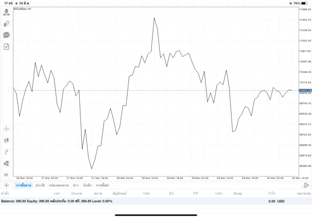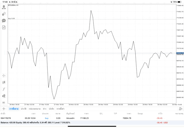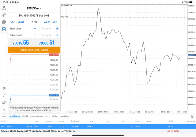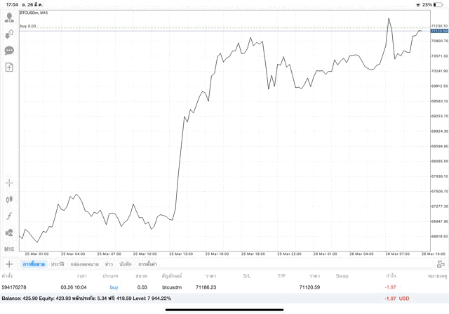 เริ่มแล้ว การเทรด Crypto BTCUSD 0.03 lot บนแอพเล่นหุ้น mt4 เมื่อราคามีการเปลี่ยนแปลงจะส่งผลต่อกำไรหรือขาดทุนขึ้นกับการเทรดครั้งนี้ เริ่มต้น ติดลบก่อนนะ
