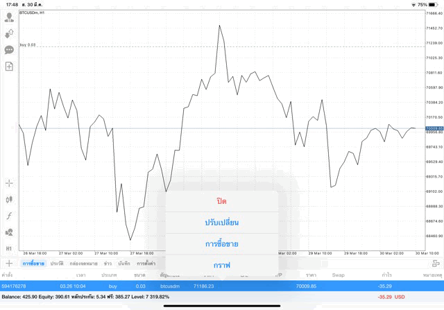 การเทรด Crypto BTCUSD 0.03 lot บนแอพเล่นหุ้น mt4 โบรกเกอร์ forex exness