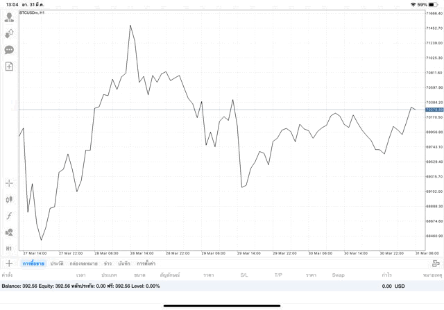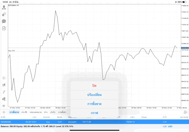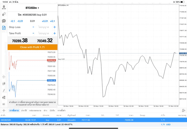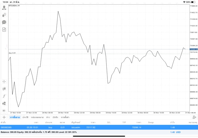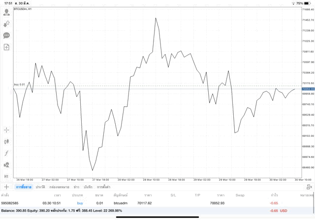 เริ่มแล้ว การเทรด Crypto BTCUSD 0.01 lot บนแอพเล่นหุ้น mt4 เมื่อราคามีการเปลี่ยนแปลงจะส่งผลต่อกำไรหรือขาดทุนขึ้นกับการเทรดครั้งนี้ เริ่มต้น ติดลบก่อนนะ