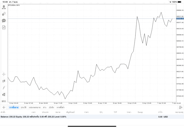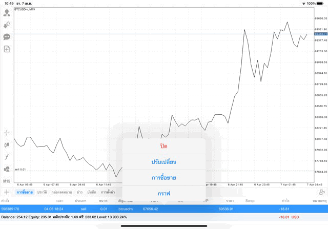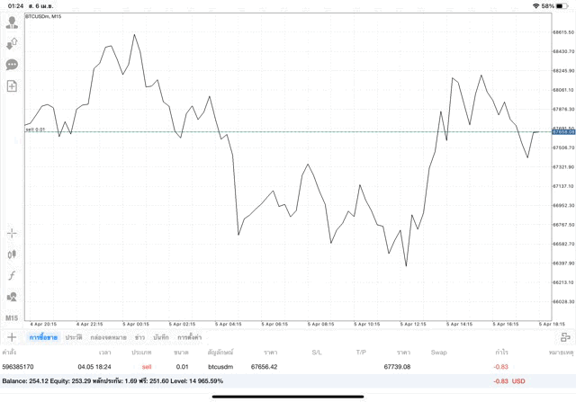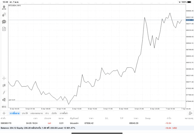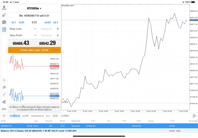 เริ่มแล้ว การเทรด Crypto BTCUSD 0.01 lot บนแอพเล่นหุ้น mt4 เมื่อราคามีการเปลี่ยนแปลงจะส่งผลต่อกำไรหรือขาดทุนขึ้นกับการเทรดครั้งนี้ เริ่มต้น ติดลบก่อนนะ
