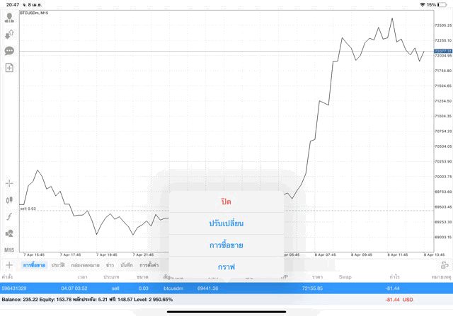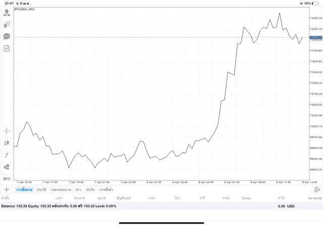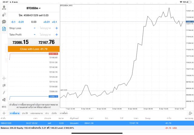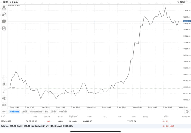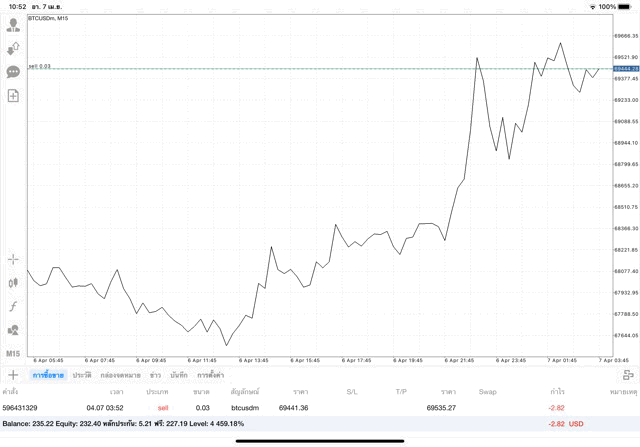 เริ่มแล้ว การเทรด Crypto BTCUSD 0.03 lot บนแอพเล่นหุ้น mt4 เมื่อราคามีการเปลี่ยนแปลงจะส่งผลต่อกำไรหรือขาดทุนขึ้นกับการเทรดครั้งนี้ เริ่มต้น ติดลบก่อนนะ