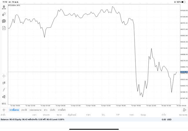 เริ่มแล้ว การเทรด Crypto BTCUSD 0.01 lot บนแอพเล่นหุ้น mt4 เมื่อราคามีการเปลี่ยนแปลงจะส่งผลต่อกำไรหรือขาดทุนขึ้นกับการเทรดครั้งนี้ เริ่มต้น ติดลบก่อนนะ