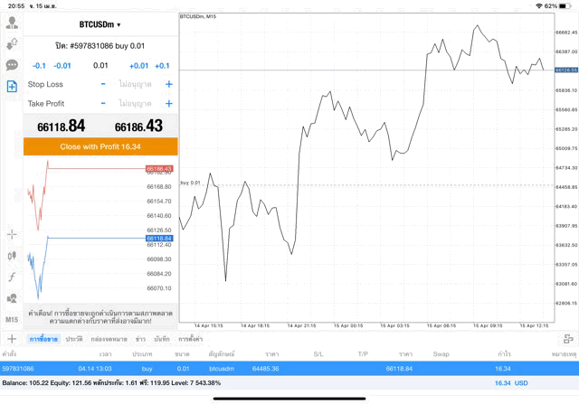 การเทรด Crypto BTCUSD 0.01 lot บนแอพเล่นหุ้น mt4 โบรกเกอร์ forex exness
