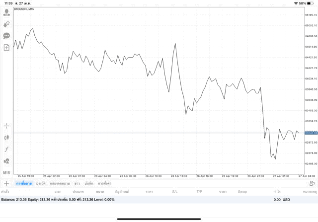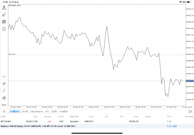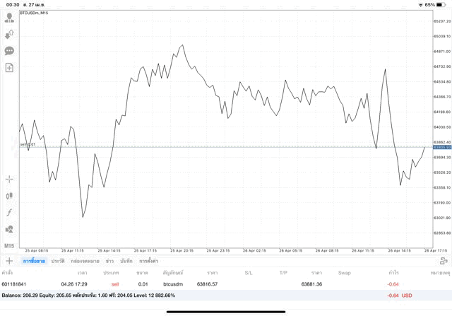 เริ่มแล้ว การเทรด Crypto BTCUSD 0.01 lot บนแอพเล่นหุ้น mt4 เมื่อราคามีการเปลี่ยนแปลงจะส่งผลต่อกำไรหรือขาดทุนขึ้นกับการเทรดครั้งนี้ เริ่มต้น ติดลบก่อนนะ