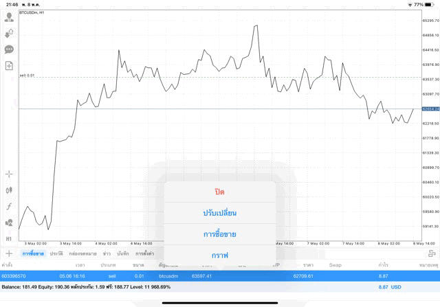 การเทรด Crypto BTCUSD 0.01 lot บนแอพเล่นหุ้น mt4 โบรกเกอร์ forex exness