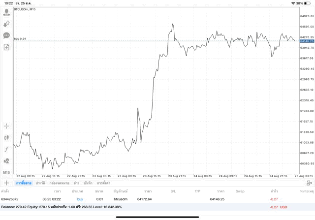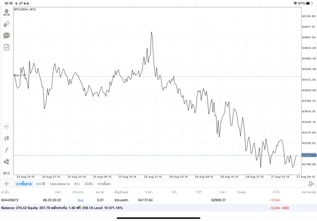 เริ่มแล้ว การเทรด Crypto BTCUSD ๐.๐๑ lot บนแอพเล่นหุ้น mt๔ เมื่อราคามีการเปลี่ยนแปลงจะส่งผลต่อกำไรหรือขาดทุนขึ้นกับการเทรดครั้งนี้ เริ่มต้น ติดลบก่อนนะ