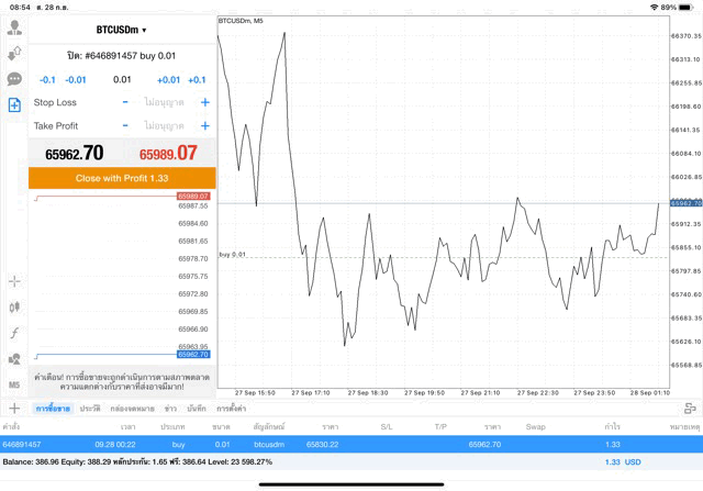 การเทรด Crypto BTCUSD ๐.๐๑ lot บนแอพเล่นหุ้น mt๔ exness ทดลองเล่นฟรี