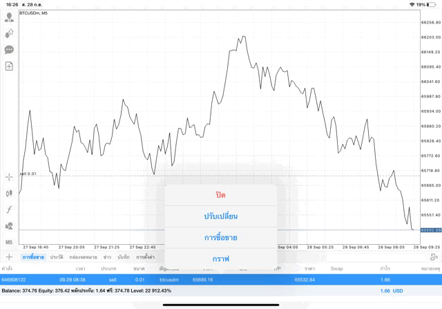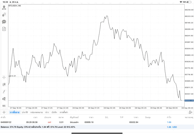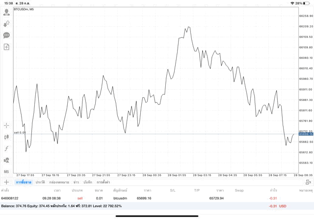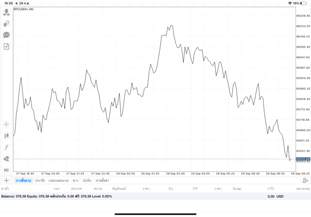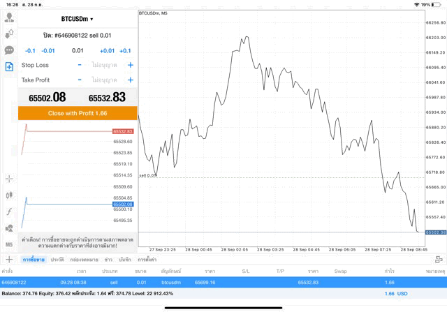 เริ่มแล้ว การเทรด Crypto BTCUSD ๐.๐๑ lot บนแอพเล่นหุ้น mt๔ เมื่อราคามีการเปลี่ยนแปลงจะส่งผลต่อกำไรหรือขาดทุนขึ้นกับการเทรดครั้งนี้ เริ่มต้น ติดลบก่อนนะ