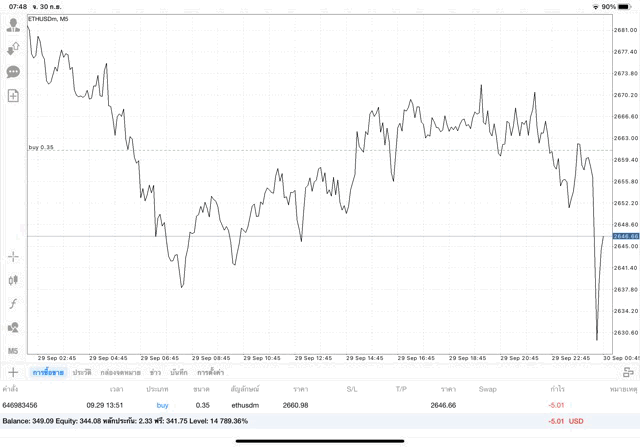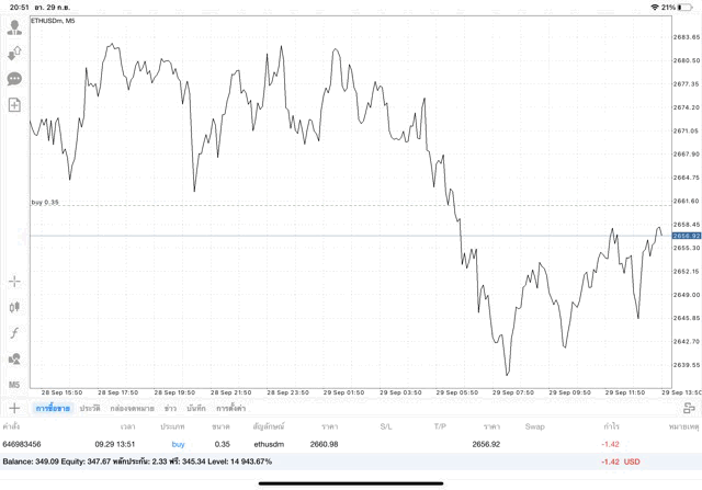 เริ่มแล้ว การเทรด Crypto ETHUSD ๐.๓๕ lot บนแอพเล่นหุ้น mt๔ เมื่อราคามีการเปลี่ยนแปลงจะส่งผลต่อกำไรหรือขาดทุนขึ้นกับการเทรดครั้งนี้ เริ่มต้น ติดลบก่อนนะ