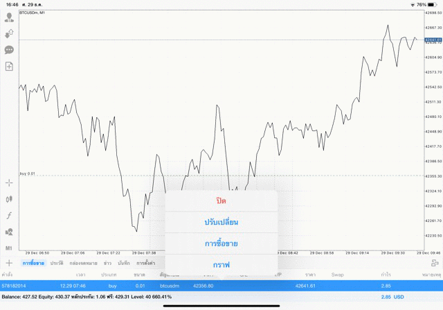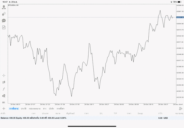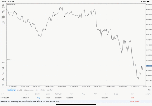 เริ่มแล้ว การเทรด Crypto BTCUSD 0.01 lot บนแอพเล่นหุ้น mt4 เมื่อราคามีการเปลี่ยนแปลงจะส่งผลต่อกำไรหรือขาดทุนขึ้นกับการเทรดครั้งนี้ เริ่มต้น ติดลบก่อนนะ