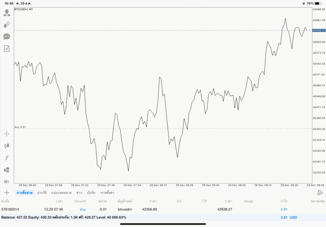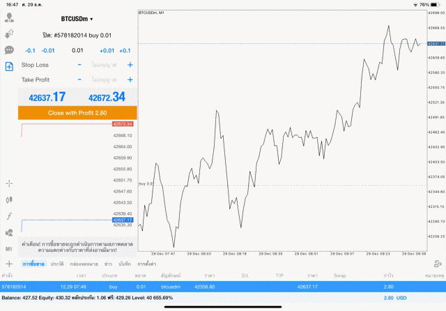 การเทรด Crypto BTCUSD 0.01 lot บนแอพเล่นหุ้น mt4 โบรกเกอร์ forex exness