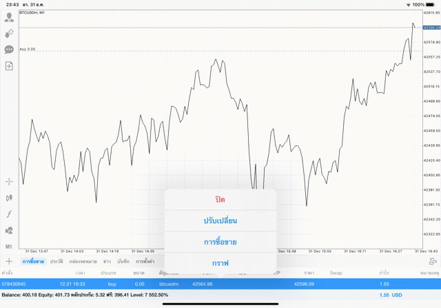 การเทรด Crypto BTCUSD 0.05 lot บนแอพเล่นหุ้น mt4 โบรกเกอร์ forex exness