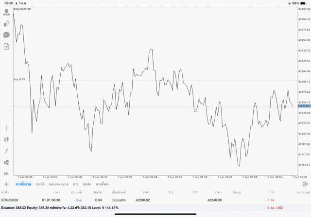 เริ่มแล้ว การเทรด Crypto BTCUSD 0.04 lot บนแอพเล่นหุ้น mt4 เมื่อราคามีการเปลี่ยนแปลงจะส่งผลต่อกำไรหรือขาดทุนขึ้นกับการเทรดครั้งนี้ เริ่มต้น ติดลบก่อนนะ