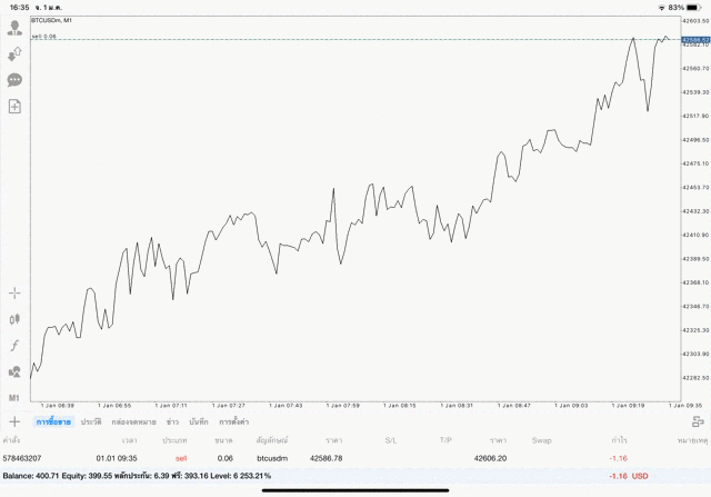 เริ่มแล้ว การเทรด Crypto BTCUSD 0.06 lot บนแอพเล่นหุ้น mt4 เมื่อราคามีการเปลี่ยนแปลงจะส่งผลต่อกำไรหรือขาดทุนขึ้นกับการเทรดครั้งนี้ เริ่มต้น ติดลบก่อนนะ