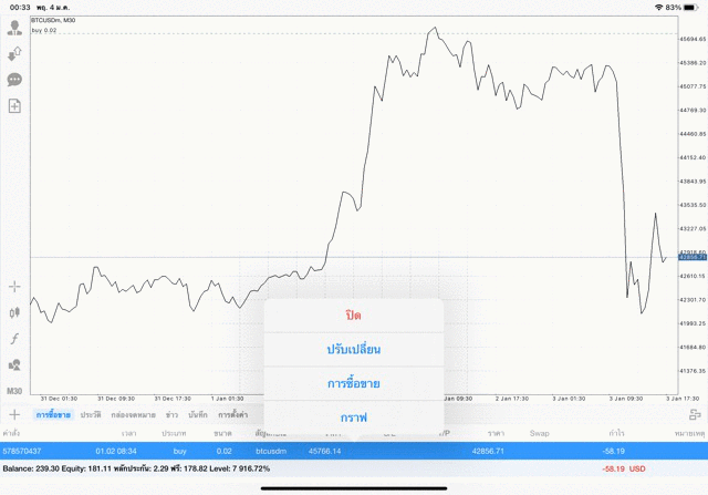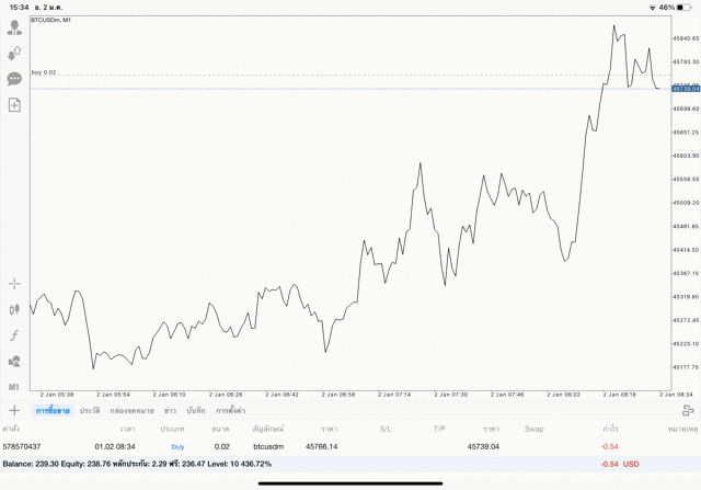 เริ่มแล้ว การเทรด Crypto BTCUSD 0.02 lot บนแอพเล่นหุ้น mt4 เมื่อราคามีการเปลี่ยนแปลงจะส่งผลต่อกำไรหรือขาดทุนขึ้นกับการเทรดครั้งนี้ เริ่มต้น ติดลบก่อนนะ